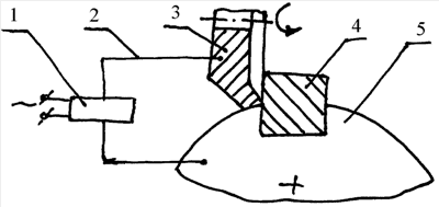 От источника 1 электрического тока промышленной частоты 50 Гц, через токоподводящие шины 2, один конец вторичной обмотки установки подводится к детали 5 со шпоночным пазом и шпонкой 4, а второй – к инструменту-электроду 3. Обеспечив надежный контакт в соединении инструмент-электрод 3 с поверхностью шпоночного паза детали 5 производится включение электрического тока и задается перемещение инструменту-электроду 3. Зона электроконтактного воздействия распространяется на боковую поверхность шпоночного паза и на прилегающие к нему диаметральные участки детали, без термического воздействия на зону основания. Нагрев контактной зоны производится до температуры фазовых превращений металла детали 900-1000°С. Быстрое охлаждение разогретого металла в тело холодной детали и шпонку позволяет получить закаленный слой глубиной 2-4 мм. Ширина закаленной зоны составляет 0,1 от ширины шпоночного паза.