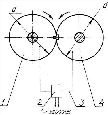 Электроконтактная обработка производится на токарно-винторезном станке 16K20. От источника электрического тока 2 промышленной частоты 50 Гц, через токоподводящие шины 3, ток подводится к инструментальному ролику 1 и к валу 4. Обеспечив надежный контакт в соединении «инструмент-поверхность», производится включение источника электрического тока и задается перемещение инструмента d и вращение детали. Зона контакта нагревается до температуры 900-1000°С, и за счет быстрого отвода тепла в тело холодной детали происходит закалка поверхностей шпоночного паза. При обработке зона электроконтактного воздействия распространяется на боковые поверхности шпоночного паза и на прилегающие к нему диаметральные участки вала d без термического воздействия на зону основания. В результате обработки твердость поверхностей шпоночного паза и поверхностного слоя по диаметру вала возрастает до 56…60 при глубине закалки до 3 мм. Структура поверхностного слоя представляет мелкодисперсный мартенсит при наличии аустенита остаточного.