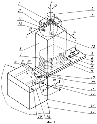 Доориентация уплотнения 4, расположенного на шибере 8 в пространстве, происходит по трем направлениям (фиг.2). Доориентация плоского уплотнения 4 относительно плоскости его установки на собираемом узле осуществляется при помощи шарнирного подвеса питателя 3 первого податливого крепления к неподвижной поверхности плиты 1 и упора шибера 8 заходными фасками б’ в горизонтальные фаски паза 19 поворотом на углы  ,  ,  (фиг.2).