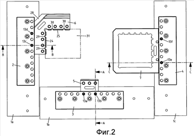 В этой проекции можно видеть, в частности, также третий зажимной выступ 28 имеющего форму уголка посадочного места 6, который расположен между обоими, смещенными относительно друг друга на 90°, зажимными выступами 26, 27 (фиг.1). Кроме того, видна схематично изображенная, закрепленная на имеющем форму уголка посадочном месте 6, деталь 31. За счет выполненных на внутренней стороне в плечах имеющего форму уголка посадочного места 6 прорезей 29, 30 обеспечивается пропускание (вдевание) электроэрозионной проволоки между закрепленной на посадочном месте 6 деталью 31 и посадочным местом 6. За счет этого можно обрабатывать закрепленную на посадочном месте 6 деталь 31 также с задней стороны с помощью электроэрозии, или же деталь 31 может известным образом автоматически занимать положение за счет подвода электроэрозионной проволоки со всех сторон.