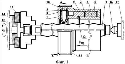 При обработке заготовка получает вращение Vз, а устройство для упрочнения – движение продольной подачи Sпр вдоль оси обрабатываемой заготовки. Во время ввода устройства в обрабатываемое отверстие деформирующие тарельчатые пружины 7 находятся в свободном состоянии и их внутренний диаметр отверстия больше наружного диаметра обрабатываемого винта; количество тарельчатых пружин 7 в пакете должно быть четное, не менее двух и зависит от конкретных условий обработки и технических требований, предъявляемых к обрабатываемой поверхности, устанавливается экспериментально с учетом конструктивных особенностей.