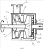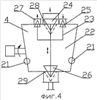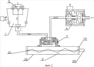 Установка для производства пенобетона работает следующим образом. Дозируемая доля песка и 80% цемента от общего количества подается шнеком в расходный бункер, а 20% объема цемента направляется в смеситель 1 первой ступени, выполненный в виде активатора и действующего в режиме круговорота смеси цементно-водной суспензии из центробежного дезинтегратора 6, где, проходя через зубцы 12,15, смесь многократно завихряется и измельчается с одновременным перемешиванием. Далее смесь веществ уже измельченная засасывается во входной канал центробежной крыльчатки 13, укрепленной на одном валу 10 с диском 11. Попадая на лопасти крыльчатки 13, смесь под действием центробежной силы нагнетается в корпус насоса 5, а затем выходит из устройства через выходной патрубок 8. Крыльчатка 13 создает тягу движения смеси через дезинтегратор 6. Засасываемая смесь, проходя по входному патрубку 7, попадает на вращающийся с большим числом оборотов (1500-3000 об/мин) дезинтегратор 6. Изменяя частоту зубцов 12, 15 и количество их рядов, а также частоту вращения вала, можно использовать устройство для различных целей в области производства строительных материалов. На схеме центробежного дезинтегратора (фиг.3) представлено движение зубцов 12,15 дезинтегратора 6 и измельченного материала сквозь них. На 1-ом, 3-ем и 5-ом ряду представлены зубцы 15 на диске 14. Вдоль рядов происходит движение зубцов друг относительно друга. Движение материала происходит от центра между зубцами. Они постоянно закрывают и открывают окна прохода, а также создают завихрение частиц материала. В результате чего материал достигает наружного диаметра дезинтегратора 6 уже в измельченном и смешанном виде. В результате чего достигается высокое качество смеси и помола. Зазор между рядами зубцов 12, 15 во избежание заклинивания в результате противоположного вращения деталей выполняется в допуске 0,6 мм. Затем смесь поступает в емкость по трубопроводу, при этом смесь цементно-водной суспензии проходит в течение 10 минут через активатор, где происходят начальная гидратация цемента с водой и взаимодействие компонентов в целом, и дальнейшая передача смеси цементно-водной суспензии на вторую ступень перемешивания в смеситель 2. Подача пенообразователя осуществляется по трубопроводу в дозатор 4. Конусные клапана 25, 26 посредством коромысла 23 при положении “внизу” – одновременного открытия отверстия 26 на заполнение пенообразователем корпуса и отверстия 27 сообщения с атмосферой и закрывания отверстий 28, 29 на ввод воды и вывод смеси пенообразователя с водой, а при положении “вверху” – одновременного открывания клапанами отверстия на вход воды, на вывод смеси пенообразователя с водой.