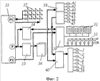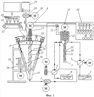 Дозирующе-смешивающий аппарат (фиг.1) состоит из смесителя 1 компаунда, смесителя 2 компаунда с отвердителем, шестеренного или плунжерного насоса 3 подачи компаунда, шестеренного или плунжерного насоса 4 подачи отвердителя, которые имеют раздельный электропривод, насоса 5 промывной системы, емкости отвердителя 6, емкости 7 растворителя, привода смесителя 1 в виде электродвигателя 8, водила 9 привода мешалок смесителя 1, рамы 10, подвески 11, на которой смонтирован смеситель 2 компаунда с отвердителем, планетарный привод 12 с электродвигателем 13 смесителя 2 компаунда с отвердителем. Смеситель 1 состоит из корпуса 14 конической формы, в котором расположены центральная мешалка 15 и две боковые мешалки 16, которые базируются на водиле 9. Боковые мешалки 16 имеют привод вращения от электродвигателя 8 через муфту 17 и ременные передачи 18 с передаточным числом, равным единице. Мешалки 15 и 16 снабжены спиралями 19, закрепленными в водиле 9 и охватывающими поверхность стержней, на которых смонтированы мешалки 16. Смеситель 2 устроен как одношнековый, т.е. его мешалка 20 располагается по оси цилиндрического корпуса 21 и охватывается спиралью 22 круглого сечения, закрепленной неподвижно в водиле последней ступени планетарного привода 12. Витки спирали 22 по внешней поверхности примыкают к внутренней поверхности корпуса 21 смесителя 2. Аппарат оборудован устройством для дозированной подачи порошковых и жидких компонентов в зону приготовления компаунда, который выполнен в виде ленточного транспортера 23 с загрузочными бункерами 24 оборудованными электронными весами 25. Подогреватель корпуса 14 выполнен в виде электрокалорифера 26. Устройство подачи жидкого полимерного материала в смеситель 1 компаунда состоит из емкости 27 насоса 28 с приводом от электродвигателя 29. Автоматическая система управления представляет собой управляющий технологический контроллер 30 (с использованием известной элементной базы) с цифровой индикацией 31 и световой индикацией 32. Основные функциональные блоки и узлы технологического контроллера 30 представлены на фиг.2 и включают в себя микроконтроллер 33 (с портами Р, Р1 и Р2), буферный усилитель 34, регистр-защелку 35, память программ 36, клавиатуру 37, модуль датчиков 38, модуль управления индикацией 39 и модуль управления внешними устройствами 40. Модуль управления внешними устройствами 40 соединен с устройствами: смесителем 1 компаунда, смесителем 2 компаунда с отвердителем, насосом 3 подачи компаунда, насосом 4 подачи отвердителя, насосом 5 промывной системы, электронными весами 25 и электрокалорифером 26. Модуль датчиков 38 (состоит из датчиков известной конструкции и принципа работы) включает датчик 41 смесителя 1, датчик 42 смесителя 2, датчик 43 насоса 3, датчик 44 насоса 4, датчик 45 насоса 5, датчик 46 электронных весов 25, датчик 47 электрокалорифера 26.