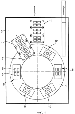 На первом этапе операции, на станции 7 загрузки, кассета 1 с изделиями 6 перемещается в чистую камеру 3 и автоматически устанавливается на поворотный диск 4. Четыре изделия 6 выгружаются одновременно из кассеты 1 и устанавливаются на держатели 5 изделий.