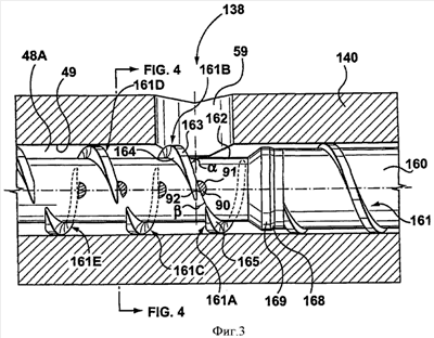 На фиг.3 и 4 показана часть экструдера 138 в сборе, соответствующего предпочтительному варианту выполнения настоящего изобретения. Указанная часть выполнена так, чтобы смягчать проблему прохождения потока расплава через область S6 вентиляции и увлечения потоком с низким давлением, которая прилегает к дополнительному отверстию 59, как описано выше. Соответственно, экструдер 138 в сборе содержит очищающее устройство, которое предназначено для очищения шнека 160 экструдера, что будет подробно описано далее, и которое служит для стирания составной части смеси с выбранных частей шнека 160 экструдера с целью возвращения ее в поток расплава и, тем самым, усиления потока до уровня, необходимого для обеспечения его дальнейшего перемещения по части 161А, 161В, 161С, 161D или 161Е винтовой линии шнека без дополнительного торможения. В остальном экструдер 138 в сборе выполнен и функционирует так, как описано ранее, и, следовательно, далее будут обсуждаться только те элементы экструдера 138 в сборе, которые были добавлены, удалены или как-то еще модифицированы с целью размещения очищающего устройства. Аналогично шнековый экструдер 138 предназначен для использования в поточной смешивающей системе 10 формования, имеющей отношению к эксперименту и описанной выше, и, следовательно, далее система 10 формования не будет описываться более подробно.