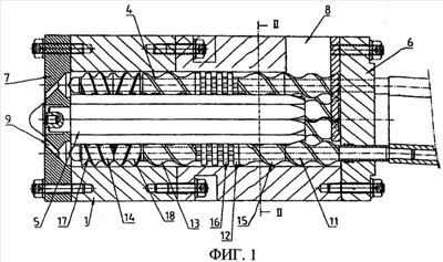 На каждый вал 4 посредством шлицевого соединения без возможности проворота насажено несколько элементов 11, 12, 13, 14. В то время как элементы 11 и 13 образуются одним транспортным шнековым сегментом, элемент 12 состоит из транспортного шнекового сегмента 15 и смесительного блока 16, а элемент 14 – из транспортного шнекового сегмента 17 с большим шагом, чем у элементов 11 и 13 транспортного шнека, а также из короткого шнекового сегмента 18 с противоположным шагом. Смесительный сегмент 16 и короткий шнековый сегмент 18 с противоположным шагом представляют собой рабочие сегменты.