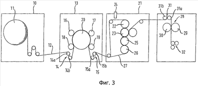 Фиксированное соотношение скоростей имеет место одновременно с фиксированным натяжением полотна, причем последнее не регулируется. Однако разные технические характеристики изделий и разные исходные материалы, вводимые посредством разматываемого рулона 11, требуют разных натяжений полотна для достижения оптимального качества изделий и безотказной работы. Кроме того, упомянутое фиксированное соотношение также определяет разность повторяющихся отрезков между печатью и тиснением, как упоминалось выше. Как бы то ни было, любая погрешность в повторяющемся отрезке приведет к «уходящим» рисункам, показанным на фиг.2. Поскольку трудно определить отрезки повторения в типичном узле, где тиснение осуществляется со стали на резину, в соответствии с настоящим изобретением осуществляют дополнительное регулирование посредством двух дополнительных станций 14 и 15 с зонами контакта, расположенных перед оборудованием для процесса печати и после такого оборудования. Как становится очевидно из фиг.3, непрерывное бумажное полотно подается в узел 13 печати и попадает в зону 14 контакта при подаче на входе, проходит через зоны печатного контакта, ограниченные печатными цилиндрами 16, 17, 18 и 19 и прижимным валом 20, а затем покидает узел 13 печати через зону 15 контакта при разгрузке на выходе. В промежутке между этими двумя зонами 14 и 15 контакта можно управлять удлинениями полотна с тем, чтобы регулировать повторяющиеся отрезки в процессах печати и тиснения. Фактически, как упоминалось выше, путем удлинения полотна 12 в рамках процесса печати можно регулировать повторяющийся отрезок печати, не регулируя фактический повторяющийся отрезок, заранее определенный оборудованием, а именно длиной окружности печатных валов и соответствующим выбором повторяющихся отрезков. Например, печатаемый орнамент с отрезками по 200 мм на печатных клише, то есть повторяющимися отрезками, заранее определенными оборудованием, можно печатать на удлиненном полотне при удлинении полотна, составляющем 5% по сравнению с его нерастянутым состоянием, таким образом, что печатаемый орнамент будет уменьшаться до примерно 190 мм на полотне после релаксации, то есть после того, как полотно 12 покинет зону 15 контакта при разгрузке на выходе. Удлинение полотна регулируется соединенными друг с другом приводами станций 14, 15 и 33 с зонами контакта.