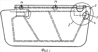 Цифровые обозначения, используемые в чертежах: узел крепления (1); корпус (2) противосолнечного козырька, выполненный из пеноинтегральной смеси; металлическая скоба (3), каркас (4); точечная сварка (5); прямоугольный паз (6-8); отверстия (9 и 10); монтажная ось (11); поверхность (12); втулка (13); отверстие (14), обеспечивающее подачу движения монтажной оси (11) в отверстиях (9 и 10); (15 и 16) – поверхности фасок, способствующие ориентации монтажной оси (13) при установке ее в отверстиях (9 и 10); пленочное покрытие (17).