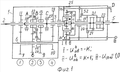 В опорах корпуса агрегата 1 соосно расположены первичный вал 2, вторичный вал 3, вал водила 4 и выходной вал 5. Параллельно им установлен промежуточный вал (ось) 6, на котором расположены два блока шестерен внешнего зацепления 7, 8 и 9, 10. Эти шестерни взаимозацеплены соответственно с шестернями внешнего зацепления 11, 12, 13 и 14, свободно установленными на первичном 2 и вторичном 3 валах. На вторичном валу 3 закреплена солнечная шестерня 15, которая зацеплена с сателлитами 16, установленными на осях водила 17 и зацепленными с эпициклическим колесом 18.Трубчатым валом 19 корпус эпициклического колеса 18 соединен с зубчатым венцом 20. На валу водила 4 рядом с зубчатым венцом 20 закреплен двухпозиционный зубчатый венец 21. На выходном валу 5 рядом с зубчатыми венцами 20 и 21 закреплен трехпозиционный зубчатый венец 22. На корпусе эпициклического колеса 18 расположен зубчатый венец 23. На водиле 17 рядом с зубчатым венцом 23 расположен зубчатый венец 24. Трехпозиционный зубчатый венец 25 закреплен на внутренней стенке корпуса агрегата 1 напротив зубчатых венцов 23 и 24. Муфты переключения 26 (А) и 27 (С) установлены соответственно между шестернями 11-12 и 13-14. Муфта переключения В состоит из двух противоположно развернутых односторонних муфт 28 и 29. Односторонняя муфта 28 установлена на шестерне 12, противоположно развернутая односторонняя муфта 29 установлена на шестерне 9 и взаимосвязана вилкой переключения 30 с муфтой 28. Трехпозиционная муфта 31 (D) с тремя внутренними зубчатыми венцами расположена на зубчатом венце 22 выходного вала 5. Ползун 32 подвижно соединен с муфтой переключения 31, на ползуне закреплен зубчатый венец 33 с внутренним и внешним зацеплениями, наружное зацепление установлено на зубчатом венце 25 корпуса 1.