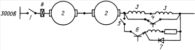На чертеже два тяговых двигателя, постоянно соединенные с якорями 2 и обмотками возбуждения 3, подключаются к напряжению контактной сети через контактор 1. Обмотки возбуждения 3 постоянно зашунтированы транзистором 4. Через контактор 5 к обмоткам возбуждения подключается индуктивный шунт с последовательно соединенным вторым транзистором 6; индуктивный шунт шунтирован диодом 7.