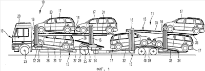 И, наконец, в DE 68910434 Т2 представлен автовоз, на котором можно перевозить до трех автомобилей, установленных в трех положениях друг над другом. При этом каждый автомобиль помещается на свою собственную платформу для обеспечения по возможности максимально плотного размещения автомобилей с целью повысить грузовместимость автовоза. Этот автовоз также не представляется возможным реализовать на практике из-за его габаритной высоты, превышающей максимальную габаритную высоту, допустимую для грузовых автомобилей согласно принятым в Европейском Союзе нормам.