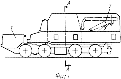 Кузов агрегата разделен на два отсека: грузовой теплоизолированный для размещения изделия 4, расположенного в защитно-стыковочном модуле 5, выполненном в виде колпака. Изделие помещено в контейнер 6. В другом отсеке на задней части платформы установлено погрузочно-разгрузочное средство (например, манипулятор) 7 с грузоподъемной поворотной стрелой.