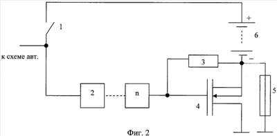 Работает устройство следующим образом: положительный потенциал с аккумулятора через контакты замка зажигания 1 поступает через датчики 2…n на затвор транзистора 4 и открывает его.