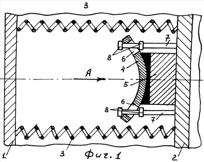 Сущность изобретения поясняется чертежами, где на фиг.1 и 2 схематично на общем виде с продольным разрезом изображен предлагаемый бампер соответственно в исходном положении и после восприятия ударной нагрузки /релейного срабатывания выпуклой пружины/; на фиг.3 – вид А на фиг.1 на выпуклую пружину.