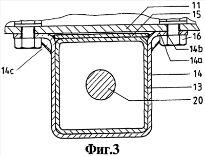 Внешнее трубчатое тело 12 состоит из корытообразного (имеющего U-образный участок, образованный “спинкой” и двумя отходящими от нее параллельными “коленами”) профиля 14 с двумя противоположными полками 14а и одной задней стенкой 15, сваренной с корытообразным профилем 14, так что в нем образован направляющий канал квадратного сечения, в который с небольшим зазором помещена также квадратная внутренняя труба 13. Корытообразный профиль 14 снабжен для жесткости вертикально удаленными друг от друга угловыми гофрами 14с.