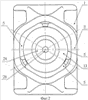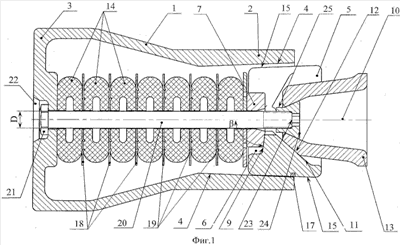 После установки в корпус 1 стяжного болта 20 и запрессовки на него упругих элементов 14 устанавливают нажимную шайбу 7. Далее в корпус 1 вставляются фрикционные клинья 5 и нажимной конус 13, внутри которого на болт 20, до упора в торец 23, навинчивается гайка 24 в виде усеченного конуса с кольцевым поясом 25 от усеченной части. Гайка имеет шестигранное отверстие 26 под ключ.