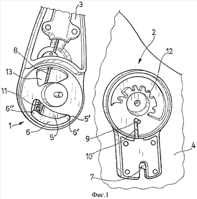 Активный элемент 6 подогнан так, что действует на изогнутый верхний конец 9 стержня 10, принадлежащего стопорному механизму 7.