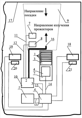При подаче питания из БУП 6 в БУО 3 создаются указательными огнями 1 информационные световые зоны желтого проблескового огня, желтого огня, зеленого огня, красного огня и красного проблескового огня. Кроме этого, соседние зоны имеют общие участки. При посадке, по мере снижения, летчик видит вначале желтый проблесковый огонь с полной модуляцией яркости, затем желтый с неполной модуляцией яркости, затем постоянный желтый, далее желто-зеленый, переходящий в зеленый и далее – зелено-красный, постоянный красный, красный с неполной модуляцией и красный проблесковый с полной модуляцией. Прожектора УО 1, базовых огней 18, 19, огней запрета посадки 20, 21 соединены с БУП 6. При подаче сигналов по линии 13 от датчиков качки корабля в БУП 6 он вырабатывает сигналы управления для элементов стабилизации 4. По линии связи 14 они передаются на гиростабилизированную платформу 2, с которой связаны элементы стабилизации 4. В результате работы исполнительных элементов стабилизации 4 стабилизируется платформа 2 в горизонтальной плоскости или в плоскости осредненного положения палубы (ОПП) и лучи УО 1 БУО 3, соединенного с гиростабилизированной платформой 2, стабилизируются в пространстве. Таким образом, происходит исключение влияния внешней среды (волнения моря) на параметры УО 1.