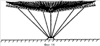 Фиг.3 изображен общий вид рефлектора сверху, где 2 – спица; 3 – консоль; 6 – сетеполотно; 7.1 – ленты; 7.4 – шнур тангенциального контура; 7.5 – шнур между спицами 2 в виде арки.