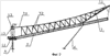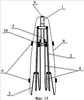 Фиг.12, 13 изображена схема расположения рефлектора раскрывом вниз, где 1 – центральный узел; 2 – спица, 3 – консоль; 4 – оттяжка; 5 – мачта; 6 – сетеполотно; 8 – технологическое приспособление.