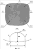 Фиг.6 изображена принципиальная схема расположения площади поверхности элемента сетеполотна между смежными узлами формообразующей структуры, где 6 – сетеполотно; 6.1 – рабочая поверхность сетеполотна; 6.2 – нерабочая поверхность сетеполотна; 7.1 – лента (например, толщиной 0,25 мм и шириной 8-16 мм), присоединенная к рабочей поверхности 6.1 сетеполотна 6; 7.4 – шнур тангенциального контура; 7.1.1, 7.1.2, 7.1.3, 7.1.4 – реперные точки (знаки), расположенные на лентах 7.1 напротив скобам 7.6.1 – узлам формообразующей структуры; h – максимальное отклонение реальной поверхности ячейки сетеполотна от теоретической поверхности 20 параболоида вращения из-за подушечного эффекта.
