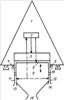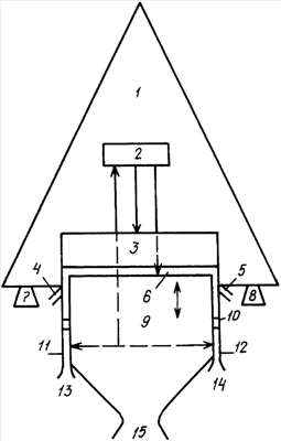 при этом корпус 1 жестко связан с блоком управления амортизаторами 2 и цилиндром с двумя углублениями 10, жестко связанным с двумя выхлопными трубами 4, 5 и имеющим пластину с двумя выступами внутри между амортизатором 3, жестко связанным с корпусом 1, имеющим жесткую связь с реактивными двигателями 7, 8, и между конусообразным амортизатором 9, жестко связанным с выхлопным соплом 15, и имеющим гидравлическую связь с первым гидравлическим выходом блока управления амортизаторами 2, имеющим второй и третий гидравлические выходы, соответственно связанные с амортизатором 3 и с предохранительными амортизаторами 11, 12 внутри соответствующих углублений цилиндра 10, и жестко связанных с вспомогательными выхлопными соплами 13, 14.