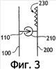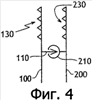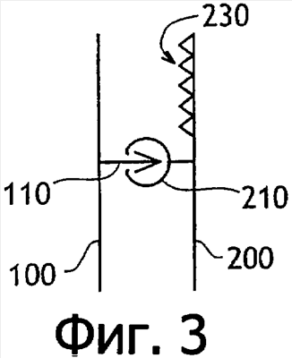 На фиг.3 показана застежка в соответствии с настоящим изобретением, содержащая два полотна-основы 100, 200, по существу параллельные друг другу, содержащие соответственно охватываемый запорный элемент 110 и охватывающий запорный элемент 210.