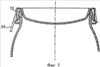 На Фиг.2 лучше всего видно, что крышка представляет собой цельную деталь, отформованную предпочтительно как единое целое из упругой пластмассы, например полипропилена. Крышка имеет фасонную закрывающую пластину, с которой выполнена как единое целое перемычка 16, которая при соединении крышки с бутылкой проходит над ободком бутылки. Свисающая юбка 18, которая проходит книзу вокруг наружного участка верхней части бутылки, выполнена как единое целое с перемычкой 16. С нижним краем юбки 18 или с ее внутренней поверхностью, смежной с ее нижним краем, соединен и выполнен с ним за одно целое кольцевой удерживающий фланец 20. В осевом сечении фланец 20 имеет удлиненную форму и соединен с юбкой 18 упругой соединительной перемычкой 22, которая имеет уменьшенную толщину и, таким образом, представляет кольцевую линию ослабления, или заданное место разрыва. Отрывной язычок 24, который проходит книзу за нижний край юбки 18, соединен с крышкой в одном окружном месте. По боковым сторонам указанный язычок соединен с юбкой 18 двумя линиями 26 ослабления, то есть участками, имеющими уменьшенную толщину.