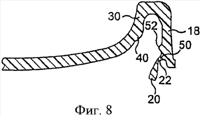Во-первых, выполненный за одно целое поворотный элемент 22 имеет одно или несколько небольших отверстий 50, выполненных в нем. Во-вторых, кольцевое ребро, или утолщение 52, выполнено за одно целое на внутренней поверхности свисающей юбки 18. Когда крышка защелкивается на контейнере, фланец поворачивается кверху примерно на 180° с переходом в конфигурацию, представленную на Фиг.9. Утолщение 52 принудительно вводится в контакт с наружной поверхностью уплотнительного фланца 20 и образует с ним уплотнение. Усилие, с которым утолщение давит на уплотнительный фланец, также вызывает повышение контактного давления в месте контакта внутренней поверхности уплотнительного фланца и наружной поверхности горлышка 8, и, таким образом, уплотнение контейнера улучшается одновременно на двух отдельных участках. Более того, утолщение 52, уплотнительный фланец 20, поворотный элемент 22 и свисающая юбка 18 ограничивают кольцевую полость 54. Данная полость сообщается с внешней средой через отверстие (отверстия) 50, но обычно изолирована от внутреннего пространства контейнера. Однако если давление внутри контейнера повышается до крайне высокого уровня, крышка деформируется из-за давления, и уплотнения на верхней и внутренней поверхности горлышка нарушаются. Юбка 18 также деформируется в наружном направлении и, таким образом, нарушается уплотнение между утолщением 52 и уплотнительным фланцем 20. Таким образом, внутреннее пространство контейнера сообщается с внешней средой через отверстие (отверстия) 50 и тем самым из него отводится газ. Далее давление падает до тех пор, пока оно не достигнет уровня, при котором упругие свойства крышки будут достаточны для восстановления ее формы, преодолевая уменьшенное давление газа, находящегося внутри контейнера. После этого восстанавливаются те или иные уплотнения, и отвод газа из внутреннего пространства контейнера завершается, при этом давление газа, находящегося в контейнере, все еще достаточно высоко. Таким образом, содержимое контейнера сохраняется в нем и пригодно к употреблению.