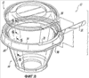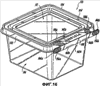 Когда крышечная часть 12 закрыта на части 14, являющейся основанием, выступающее ребро 30 сопрягается с продолжающейся по окружности канавкой 22 на крышечной части 12, а продолжающийся обод 32 сопрягается с запирающим заплечиком 20 на крышечной части 12. Кроме того, продолжающийся наружу периферийный фланец 24 на крышечной части 12 примыкает к верхнему периферийному ободу 28 на части 14, являющейся основанием.