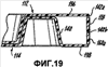 фиг.19 – вид контейнера, показанного на фиг.16, в частичном поперечном сечении по линии 19-19 на фиг.18, в частности, иллюстрирующий конфигурацию шарнира, верхний и нижний выступы, ломкий участок и ослабленную линию, ограничивающую язычок, связанный с нижним выступом;