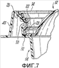фиг.7 – вид контейнера, показанного на фиг.1, в частичном поперечном сечении по линии 7-7 на фиг.3, в частности, иллюстрирующий конфигурацию части, являющейся основанием, и крышечной части, когда контейнер закрыт, и включающего в себя конструктивные элементы, которые способствуют зацеплению между частями, представляющими собой основание и крышку, обеспечивающему возможность повторного разъединения/повторного закрывания;