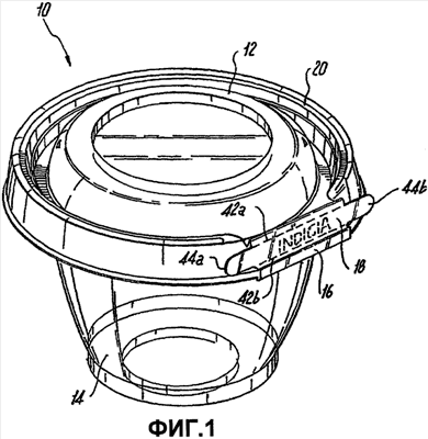 Согласно представленному в качестве примера варианту осуществления изобретения, показанному на фиг.1 и 2, контейнер 10 содержит, в общем, круглую крышечную часть 12 и, в общем, чашеобразную часть 14, являющуюся основанием, соединенные посредством шарнира 16. Шарнир 16 содержит ломкий участок 18, свидетельствующий о вскрытии, который при его удалении разъединяет составляющее одно целое соединение между крышечной частью 12 и частью 14, являющейся основанием.