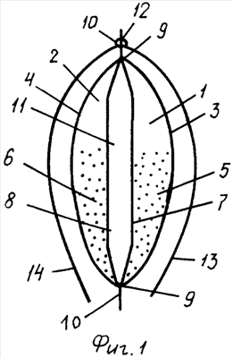 На фиг.2 представлен общий вид поплавковой камеры 11, у которой листовые стенки 7 и 8 скреплены герметичным швом 9 с образованием общей кромки 10, при этом шов 9 в верхней и нижней частях стенок 7 и 8 выполнен двухрядным.