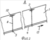 Наклонный ленточный конвейер с подвесной лентой содержит бесконечно замкнутую на приводном и натяжном барабанах (не показаны) ленту 1, тележку натяжного устройства грузового типа (не показана) с возможностью ее перемещения по раме (не показана), улавливающее устройство, включающее два закрепленных на раме 2 конвейера стальных проволочных каната 3 и 4. Каждый канат 3 и 4 одним концом закреплен на раме приводного барабана (не показаны), а другим соединен с шарнирно установленной на основании конвейера перед направляющей рамой натяжного устройства поворотной стойкой (не показана) с возможностью ее взаимодействия с упором (не показан) рамы 2 конвейера, размещенным со стороны приводного барабана, и поворота в сторону натяжного устройства. При этом со стороны приводного барабана закреплены оба каната 3 и 4, а с противоположной стороны поворотная стойка соединена кинематической связью (не показана) с тележкой натяжного устройства. Канаты 3 и 4 соединены между собой жесткими поперечными связями 5. Жесткие поперечные связи 5 с минимальными зазорами 6 размещены под грузонесущей ветвью ленты 1 и с одинаковым шагом по длине конвейера. Концы жестких поперечных связей 5 с помощью гибких элементов 7 и 8 подвешены к раме 2 конвейера с помощью шарнирных прицепных приспособлений 9 и 10 с возможностью их поворота в плоскости размещения гибких элементов 7 и 8. Гибкие элементы 7 и 8 могут быть выполнены в виде канатов или круглозвенных цепей. 11 – продольная ось конвейера, 12 – транспортируемый груз, 13 и 14 – направления движения ленты 1 при нормальной работе конвейера и после обрыва ленты, 15 – деформируемый участок ленты 1 в зоне ее удержания улавливающим устройством.