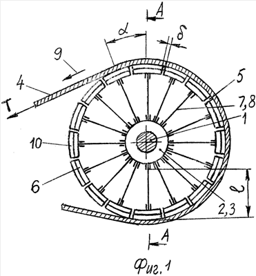 где – зазор между смежными элементами обечайки приводного барабана, м, T – максимальное натяжение конвейерной ленты в точке ее сбегания с приводного барабана, Н, – упругое удлинение конвейерной ленты при натяжении Т, l – расстояние между точкой защемления плоской пружины на ступице и цилиндрической поверхностью приводного барабана, м, Е – модуль продольной упругости материала плоской пружины, Н/м2, J – осевой момент инерции плоской пружины, м4, – коэффициент сцепления конвейерной ленты с футеровкой приводного барабана, – центральный угол между плоскими пружинами смежных элементов обечайки приводного барабана, рад, n – количество элементов обечайки приводного барабана.