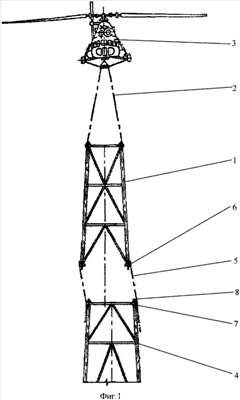 Секция 1 длинномерной монтируемой конструкции подвешена на тросах 2 к летательному аппарату 3, например вертолету, для ее транспортировки к месту монтажа и установки на другую ранее установленную секцию 4. На подцепленной к летательному аппарату 3 секции 1 закреплены направляющие тросы 5. На каждой монтируемой секции 1 и 4 монтируют верхние 7 и нижние 6 стыковочные фланцы. Нижние стыковочные фланцы 6 выполняют с приемными каналами (не показаны на чертеже), а верхние фланцы 7 – с жесткими конусообразными ловителями 8 точной наводки. В нижних фланцах 6 выполнены отверстия 9 для пропуска через них направляющих тросов 5.