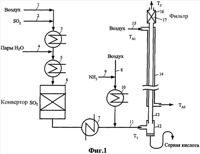 В соответствии с этим изобретением концентрацию тумана кислоты в газовом потоке, отходящем от фильтра, понижают до уровня менее 10 мольных частей на млн серной кислоты добавлением потока, содержащего аммиак в количестве, соответствующем 0,1-20 частей на млн аммиака по объему в газовом потоке на входе башни. Требуемая концентрация аммиака в газе почти не зависит от концентрации паров серной кислоты. Аммиак может быть добавлен в виде 0,1-100 об.% паров аммиака в воздухе, но чаще используют 1-10 об.% NH3 в воздухе. Смесь аммиака с воздухом может быть получена смешением безводного аммиака и воздуха или барботированием воздуха через водный аммиак. Содержащий аммиак газ предпочтительно подогревают выше точки конденсации газа перед конденсацией серной кислоты.