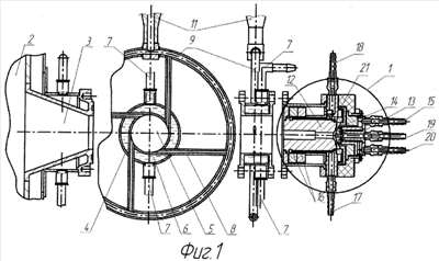 Устройство ввода тетрахлорида кремния в плазму водорода состоит из собранных и установленных соосно плазмотрона (1), корпуса реактора водородного восстановления (2) с посадочным местом плазмотрона (3), имеющим свободный выход в объемное пространство реактора, и установленным между корпусом реактора и плазмотроном распределителем смеси водорода и тетрахлорида кремния (4), который представляет собой полую цилиндрическую камеру смешения (5), имеющую охлаждаемую рубашку, герметичную с торцов (6), патрубки ввода и вывода воды (7). Пары тетрахлорида кремния с водородом подаются через 3÷8 тангенциальных вводов (патрубков) (8) в камеру смешения с плазмой водорода при температуре 5000÷6000°С. Тангенциальные патрубки ввода тетрахлорида кремния (8) сообщаются с общим коллектором тороидальной формы (9), связанным с испарителем-смесителем тетрахлорида кремния с водородом (10) через подводящий патрубок (11). Суммарная площадь отверстий тангенциальных вводов должна быть равна общей площади сечения тороидального коллектора для прохождения парогазовой смеси в распределителе, а внутренний диаметр камеры должен соответствовать диаметру анодной части (12) плазмотрона (1), соосно присоединенного к распределителю парогазовой смеси (4) и имеющего также катодную часть (13). В межэлектродный зазор (14) подается плазмообразующий газ – водород через штуцер (15), где под воздействием электрического разряда между анодом и катодом плазмотрона образуется плазма атомарного водорода, выходит из сопла и попадает с перемешиванием в распределитель парогазовой смеси (4). Для увеличения срока службы анодная часть снабжается кольцевыми постоянными магнитами (16), которые придают плазме крутящий момент, с постоянным изменением ее места по внутреннему диаметру анодной части, охлаждаемой через ввод (17) и вывод (18) воды, катодная часть плазмотрона также охлаждается через ввод (19) и вывод (20) воды, во избежание короткого замыкания между анодной и катодной частями устанавливается диэлектрическая межэлектродная вставка (21).