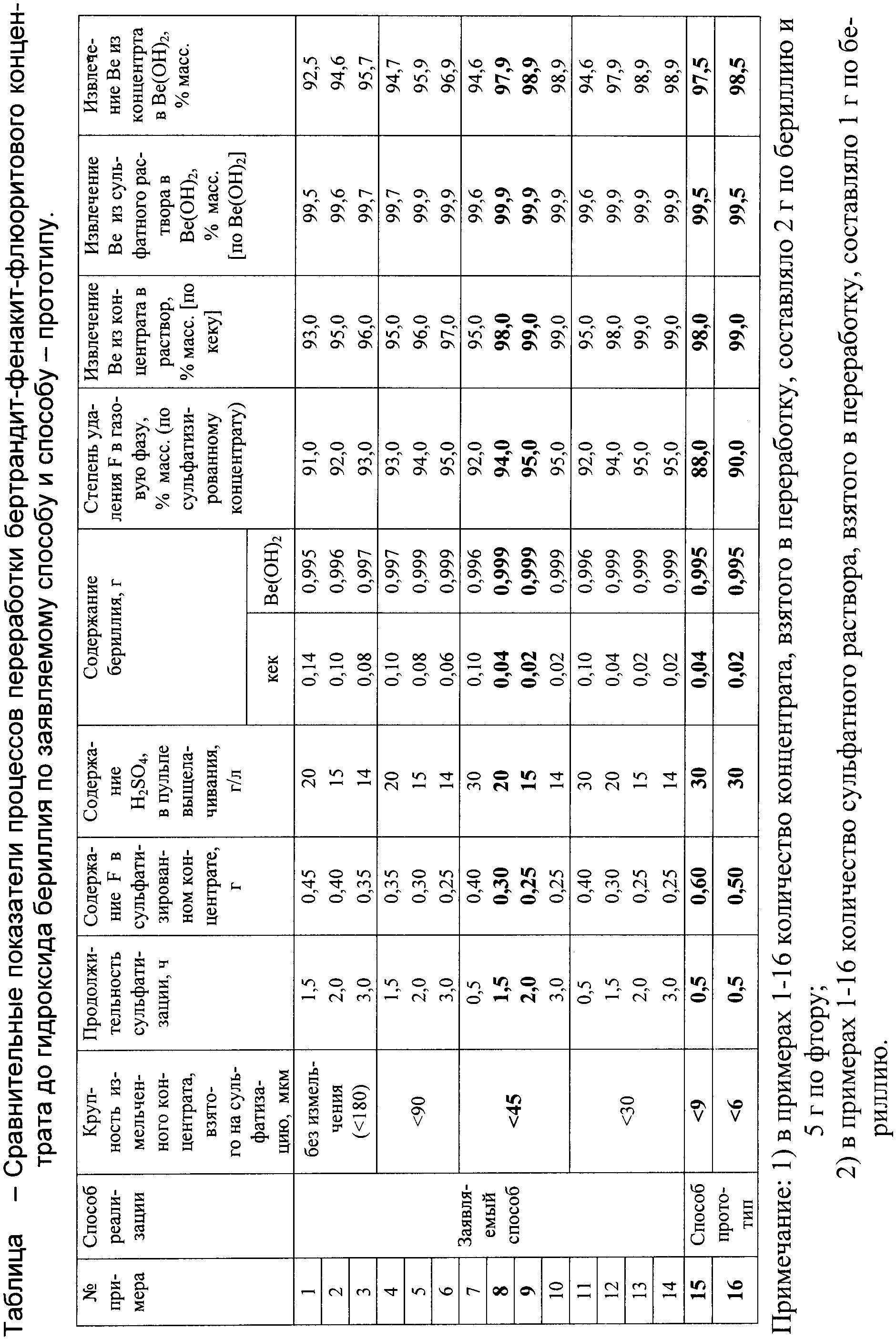 Изобретение относится к металлургии, в частности к переработке бериллийсодержащих рудных концентратов до гидроксида бериллия. Известен способ переработки концентрата бертрандит-фенакит-флюоритового с концентратом берилловым, содержащих 4 мас.% и 2 мас.% бериллия соответственно, основанный на плавлении смеси указанных концентратов с содой [см. Журкова З.А, Матясова В.Е., Матясов Н.Г., Самойлов В.И. Способ извлечения бериллия из бериллийсодержащих концентратов. А.с. 2107742. 1996]. Согласно данному способу, принятому за аналог, высокую химическую активность концентратов достигают тем, что концентраты смешивают с получением массового соотношения SiO2:CaO в их смеси, равного 1,4, в смесь концентратов добавляют карбонат натрия до получения массового соотношения SiO2:(CaO+Na2O) в шихте, равного 1,1÷1,3 (химическая активация). Приготовленную шихту плавят, плав гранулируют в воде, гранулят подвергают мокрому измельчению до крупности менее 150 мкм, полученную водно-гранулятную пульпу сгущают и проводят ее сульфатизацию серной кислотой при 120°С. Далее сульфат бериллия выщелачивают из сульфатной массы водой. Способ-аналог обеспечивает извлечение бериллия из гранулята в сернокислый раствор на 97-99 мас.% Указанный способ не лишен недостатков, т.к. он: – не обеспечивает утилизацию ценного компонента бертрандит-фенакит-флюоритового концентрата – фтора. Поэтому способу практически весь фтор, содержащийся в исходной шихте, извлекается вместе с бериллием в сульфатный раствор, что ведет к получению богатого по фтору раствора сульфата бериллия и снижает в дальнейшем полноту осаждения бериллия из указанного раствора в гидроксид бериллия нейтрализацией раствора аммиачной водой; – требует проведения пятистадийной дорогостоящей подготовки концентратов к сернокислотному вскрытию, включающей шихтовку бертрандит-фенакит-флюоритового концентрата с берилловым концентратом и кальцинированной содой в заданном соотношении, плавку шихты, грануляцию плава, измельчение гранулята, приготовление водной пульпы измельченного гранулята с заданным соотношением Т:Ж. Согласно способу-прототипу в процессе одностадийной активации бертрандит-фенакит-флюоритового концентрата путем его измельчения до крупности – 9 мкм происходит разрушение кристаллических решеток и увеличение удельной поверхности, содержащихся в нем минералов (механоактивация минералов), что повышает их химическую активность и обеспечивает в дальнейшем возможность глубокого вскрытия активированных таким образом бертрандита и фенакита 93%-ной серной кислотой при 250÷300°С за 30 мин с образованием водорастворимого сульфата бериллия и газообразных фтористого водорода и фтористого кремния. Образующийся в процессе сульфатизации фтористый водород интенсифицирует вскрытие активированных бертрандита и фенакита, т.к. взаимодействует с ними с образованием газообразного фтористого кремния и фтористого бериллия, который, в свою очередь, взаимодействует с серной кислотой с образованием сульфата бериллия и газообразного фтористого водорода. Газообразные фтористый водород и фтористый кремний выводится из зоны реакции и утилизируется в отдельном аппарате в виде кремнефтористоводородной кислоты. Недостатками способа-прототипа являются необходимость энергоемкого сверхтонкого помола концентрата, недост