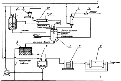 Раствор электролита заданной концентрации готовится в реакторе-растворителе 2 путем растворения отмеренного платформенными весами 1 количества твердой щелочи в деионизованной воде. Приготовленный раствор подается в реактор, одновременно с ним внутрь реактора через насос дозатор подают водноалюминиевуго суспензию, смесь которых подвергается ультразвуковому облучению для срыва оксидной пленки с поверхности частиц алюминия и начала его окисления в реакторе 3 при перемешивании и температуре электролита внутри этого реактора 65-70°С. Образующийся в результате химических реакций продукт, нанодисперсная гидроокись алюминия, отмывается от электролита на фильтре 7. Первый фильтрат возвращается в реактор-растворитель 2 для приготовления новой порции раствора электролита. С целью снижения нагрузки на фильтр легко коагулируемые осадки отделяют от надосадочной жидкости в отстойнике-осветлителе 6. Надосадочная жидкость используется для приготовления раствора электролита в реакторе 2. Вместо фильтра 7 иногда целесообразно использовать центрифугу. Необходимую сушку и прокаливание продукта проводят в электрической печи 8. Если в результате термообработки продукт теряет сыпучесть, его размалывают в шаровой мельнице 9. Аппараты 7, 8 и 9 могут быть заменены на распылительную сушилку.