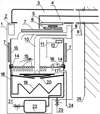 При положительных температурах наружного воздуха озоно-воздушная смесь циркулирует через озонатор – компрессор 8. При отрицательных температурах наружного воздуха, для экономии электроэнергии, для охлаждения очищаемой воды используется только воздух, забираемый из-за стены здания 25. Направление потока воздуха определяют заслонки 9. После образования кристаллов льда тяжелой воды блок управления 2 выключает компрессор, давление в емкости 13 и под ней выравнивается. Легкая вода через рассеиватели 15 вытекает, поплавковый клапан 17 всплывает, и вода стекает в накопительную емкость 18 для употребления по трубопроводу 23. После слива легкой воды поплавок клапана тяжелой воды 16 открывает сливное отверстие линии слива 24. Рассеиватели 15 при сливе задерживают взвешенную часть кристаллов тяжелой воды, которые в основном скапливаются на сетчатом фильтре 11. После таяния кристаллов тяжелой воды, она вытекает по линии 24. После расхода некоторого объема легкой воды и появления в накопительной емкости места для новой порции легкой воды, цикл очистки воды автоматически повторяется.