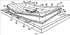Из фиг.1 и 2 очевидно, что транспортер, содержащий транспортную конструкцию 36 в виде совокупности пар коротких валков, расположенных в поперечном направлении друг против друга и разнесенных в продольном направлении, простирается по всей длине лера и определяет траекторию перемещения вдоль продольной линии отсчета. Каждый короткий валок установлен на валу (не показан), который проходит сквозь боковую стенку лера и соединен с приводом транспортера (не показан). Транспортер возврата технологических форм (не показан) простирается вдоль всей длины лера. Этот транспортер может быть разделен на некоторое количество секций, привод которых осуществляется их собственными средствами привода с помощью обычных конструкций типа ведущих валов и шестерен или цепных приводов, или приведение в движение секций транспортера может осуществляться от общего привода с помощью муфт тем способом, который хорошо известен в данной области техники. Совокупность опорных элементов 38, выполненных в виде опорных салазок технологических форм (на фиг.2 показаны только одни) транспортируется вдоль транспортера за счет вращательного контакта транспортной конструкции 36, выполненной в виде коротких валков с простирающимися в продольном направлении опорными направляющими 40, расположенными вдоль каждой стороны опорных элементов 38 в виде салазок. Простирающиеся в поперечном направлении опоры 42 (на фиг.2 показана только одна) взаимно соединяют опорные направляющие 40 и обеспечивают опору для опорных элементов нижней технологической формы, что будет рассмотрено ниже. Дополнительные простирающиеся в продольном направлении опоры 43, проходящие между опорами 42, обеспечивают дополнительную опору опорных элементов 38 в виде салазок.