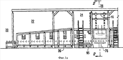 На фиг.1а и 1в представлен продольный вид сбоку конструкции лера, выполненной с возможностью гибки листов стекла, в соответствии с настоящим изобретением. На фиг.1а показан участок, расположенный выше по технологической цепочке, на фиг.1в показан участок, расположенный ниже по технологической цепочке.