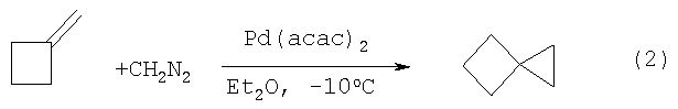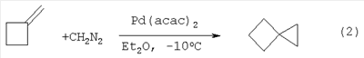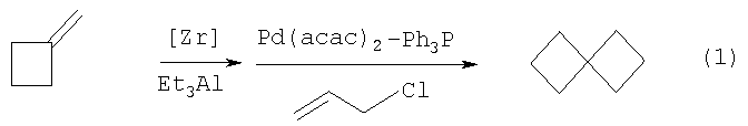 Спиро[3.3]гептан может найти применение в тонком органическом синтезе, в производстве жидкокристаллических систем, а также биологически активных веществ. Известен способ [У.М.Джемилев, В.А.Докичев, С.З.Султанов, Р.И.Хуснутдинов, Ю.В.Томилов, О.М.Нефедов, Г.А.Толстиков. Взаимодействие диазоалканов с непредельными соединениями. Сообщение 6. Каталитическое циклопропанирование различных непредельных углеводородов и их производных с диазометаном. Известия АН СССР. Сер.хим., №8, 1989, 1861-1869] получения спирогексана (2) взаимодействием метиленциклобутана с эфирным раствором диазометана в присутствии катализатора Pd(acac)2 с выходом 48% по схеме: Известный способ не позволяет синтезировать спиро[3.3]гептан формулы (1). Известен способ [B.Weinstein, A.H.Fenselau, J.G.Thoene. Syntesis of Spiro[3.3]heptane. J.Chem.Soc., 1965 (March), 2281] получения спиро[3.3]гептана (1) с выходом 50% двустадийной реакцией исходя из спирогептанкарбоновой кислоты, ацетата свинца Pb(ОАс)4, иода 12 и лития Li по схеме: Известный способ синтеза спиро[3.3]гептана (1) предполагает использование дорогостоящей и труднодоступной спирогептанкарбоновой кислоты, токсичного тетраацетата свинца, процесс проходит в две технологические стадии с выделением промежуточного продукта. Предлагается усовершенствованный способ синтеза спиро[3.3]гептана (1). Сущность способа заключается во взаимодействии метиленциклобутана с триэтилалюминием (Et3Al) в присутствии катализатора цирконацендихлорида (Ср2ZrCl2), взятых в мольном соотношении метиленциклобутан: Et3Al: Cp2ZrCl2=10: (10-14): (0.4-0.6), предпочтительно 10:12:0.5, в атмосфере аргона при комнатной температуре (20°С) и атмосферном давлении в алифатическом (гексан) растворителе в течение 5-7 ч с последующим добавлением к реакционной массе при -10°С диэтилового эфира в объеме, равном объему алифатического растворителя, затем трифенилфосфина (Ph3Р) и ацетилацетоната палладия (Pd(acac)2) в эквимольном к Cp2ZrCl2 количестве, затем свежеперегнанного аллилхлорида в трехкратном избытке на взятый Et3Al, перемешивают реакционную массу еще 5 ч. Получают целевой продукт (1) с выходом 69-78%. Реакция протекает по схеме: Целевой продукт (1) образуется только лишь с участием в качестве исходных реагентов метиленциклобутана, триэтилалюминия, аллилхлорида и комплексных катализаторов Cp2ZrCl2, Pd(acac)2 – Ph3Р. В присутствии других олефинов (например, 4-винилциклогекс-1-ена, метиленалканов, циклоолефинов), других соединений алюминия (например, EtAlCl2, изо-Bu3Al, изо-Bu2AlCl, изо-Bu2AlH) или других комплексов переходных металлов (например, Zr(acac)4, Ср2TiCl2, Ni(acac)2, Fe(асас)3) целевой продукт (1) не образуется. Проведение реакции в присутствии катализатора Cp2ZrCl2 больше 0.6 ммоль на 10 ммоль метиленциклобутана не приводит к существенному увеличению выхода целевого продукта (1). Использование в реакции катализатора Cp2ZrCl2 менее 0.4 ммоль на 10 ммоль метиленциклобутана снижает выход спиро[3.3]гептана (1), что связано с уменьшением каталитически активных центров в реакционной массе. Изменение соотношения исходных реагентов в сторону увеличения содержания Et3Al по отношению к метиленциклобутану не приводит к значительному повышению выхода целевого продукта (1). Снижение количества Et3Al по отношению к метиленциклобутану уменьшает выход спиро[3.3]гептана (1). Существенные отличия предлагаемого способа В предлагаемом способе используются в качестве исходных соединений производимые в промышленных