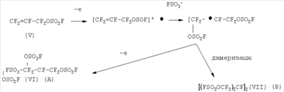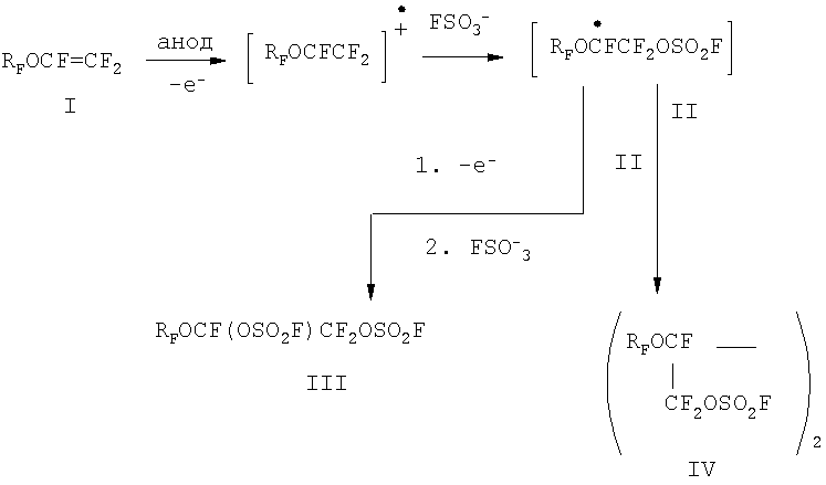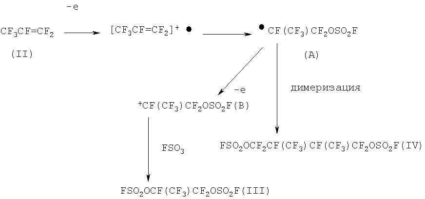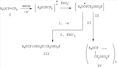 Т.о., состав продуктов потенциостатического электролиза гексафторпропилена (II) в HSO3F – (III:IV=1:1), причем чистота фторсульфатодимера (IV) составляет 97-98% – существенно отличается от состава продуктов аналогичной реакции, но проведенной в условиях гальваностатического режима, что было описано ранее (Deutschland Patent Application No DE 3128118 A1 (1981)) [1,2-бис(фторсульфонилокси)перфторпропан:бис(фторсульфонилокси)перфторизогексаны (смесь изомеров)=1:2; соотношение фторсульфатодимеров гексафторпропилена (IV): 1,4-бис(фторсульфонилокси)-2-трифторметилперфторпентан (III)=2:1]. Электрохимические превращения олефина (II) в условиях потенциостатического электролиза могут быть представлены следующей схемой: