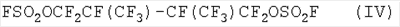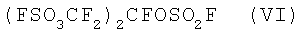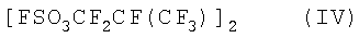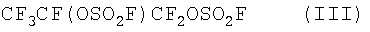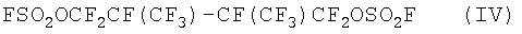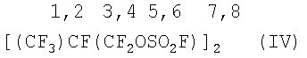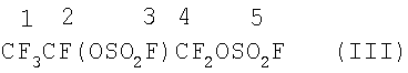Потенциостатический электролиз проводили при напряжении Е=1.9 В отн. Pd/H2. После пропускания 4000 кулон электричества (1,11А-час) (поглотилось 5 г олефина (II)) реакционную массу обработали и получили 5 г смеси фторсульфатов (III) и (IV) в соотношении (III):(IV)=1:1 (ЯМР 19F; ГЖХ). Суммарный выход (III)+(IV) по току 50%. Масс-спектр CF3CF(OSO2F)CF2 -OSO2F (III) (m/z, I rel. %): 279 [М-CF3]+ (2.5); 249 [М-SO3F] (60); 199 [CF3CFOSO2F]+ (10), 169 [С3F7]+ (40); 149 [CF2OSO2F]+ (40); 97 [CF3СО]+ (40); 83 [SO2F]+ (82), 69 [CF3]+ (60), 47 [CFO]+ (20);