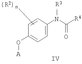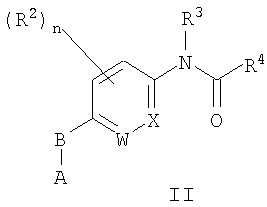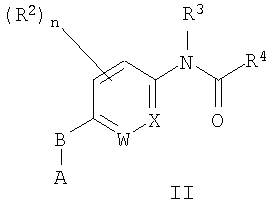 где каждый R2 независимо представляет собой Н, галоген, циано, NO2, OR5, NR6R7, алкил, замещенный алкил, циклоалкил, замещенный циклоалкил, арил, замещенный арил, гетероарил, замещенный гетероарил, гетероцикло, замещенный гетероцикло, арилалкил, замещенный арилалкил, гетероциклоалкил или замещенный гетероциклоалкил; В представляет собой О, S, SO или SO2; W и Х каждый независимо представляет собой С или N; n имеет значение от 0 до 4, если W и Х оба представляют собой С, от 0 до 3, если один из Х и W представляет собой N, и от 0 до 2, если Х и W оба представляют собой N; R3, R5, R6, R7 независимо выбраны из Н, алкила, замещенного алкила, алкенила, алкинила, замещенного алкинила, циклоалкила, замещенного циклоалкила, арила, замещенного арила, гетероарила, замещенного гетероарила, гетероцикло, замещенный гетероцикло; R4 представляет собой возможно замещенный 5-6-членный гетероарил, содержащий атом азота, при условии, что (а) если R4 представляет собой пиридил, R4 не замещен обоими группами гидрокси и метокси; и (b) если R4 представляет собой пиримидинил, он не замещен =О; А выбран из следующих соединений формул: