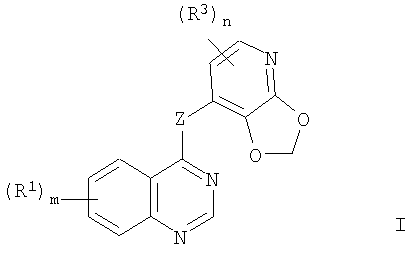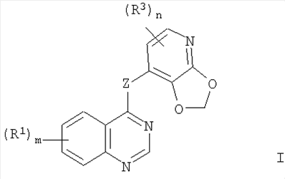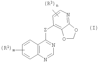 где Z – NH; m – 2; первая R1 группа, расположенная в 5-ом положении, выбрана из изопропокси и тетрагидропиран-4-илокси; вторая R1 группа, расположенная в 7-ом положении, выбрана из этокси или пропокси, замещенных хлором или определенными замещенными или незамещенными гетероциклами, содержащих, по меньшей мере, один или два атома N и, по меньшей мере, один атом О совместно с атомом N; n – 0 или 1; R3 группа, расположенная в 5-ом или 6-ом положении 2,3-метилендиоксипиридин-4-ильной группы, выбрана из Cl или Br. Также описана фармацевтическая композиция, используемая в качестве антиинвазивного агента для сдерживания распространения и/или лечения солидного опухолевого заболевания, содержащая такие производные хиназолина в сочетании с фармацевтически приемлемым разбавителем или носителем. Заявленные производные хиназолина обладают значительным противоопухолевым действием за счет эффективного ингибирования одной или нескольких нерецепторных белковых киназ, специфических к тирозину, относящихся к семейству Src киназ. 4 н. и 7 з.п. ф-лы, 2 табл.