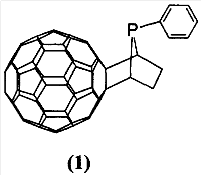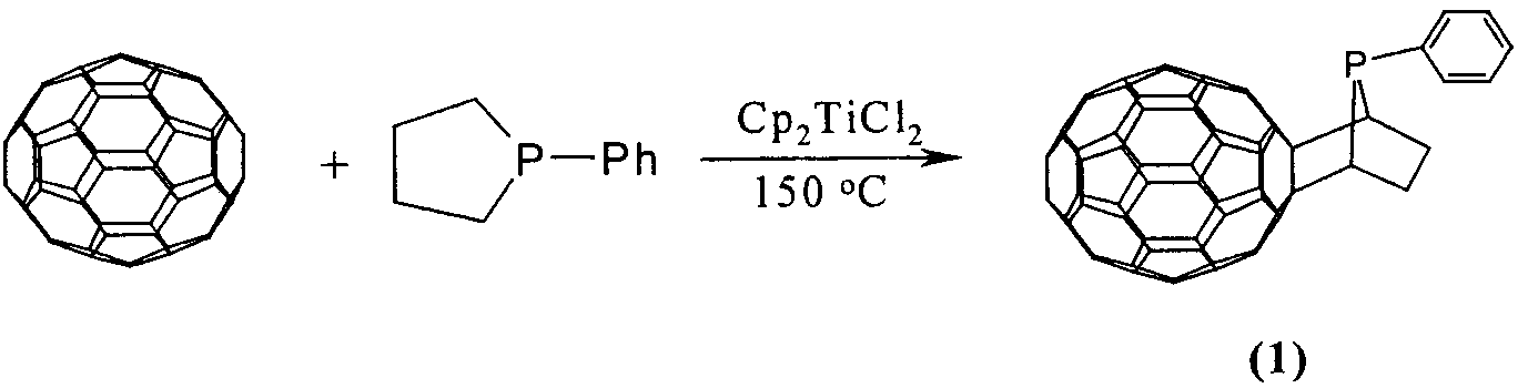 Фенилфосфолан берут с избытком по отношению к фуллерену С60 с целью повышения выхода целевого продукта (1). Снижение количества фенилфосфолана по отношению к С60 нецелесообразно, так как приводит к уменьшению выхода целевого продукта.